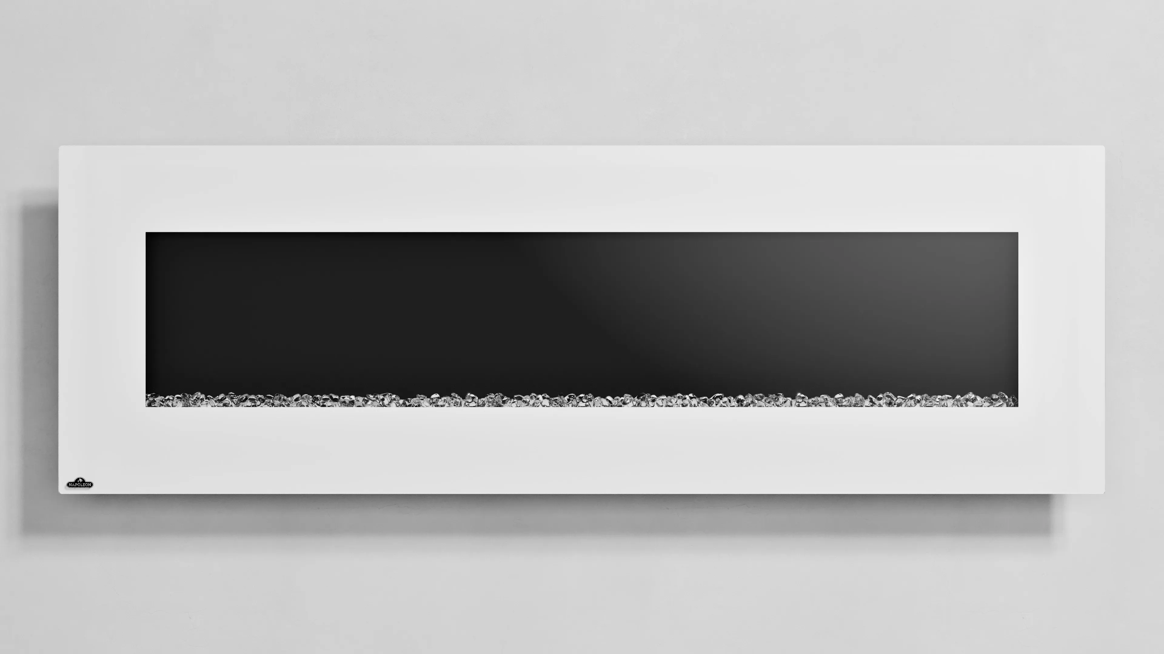 Crisp, neutral-background angles highlighting the rectangular white frame, black glass viewing area, and the ember/crystal bed—built for e-commerce PDPs, catalogs, and distributor materials.