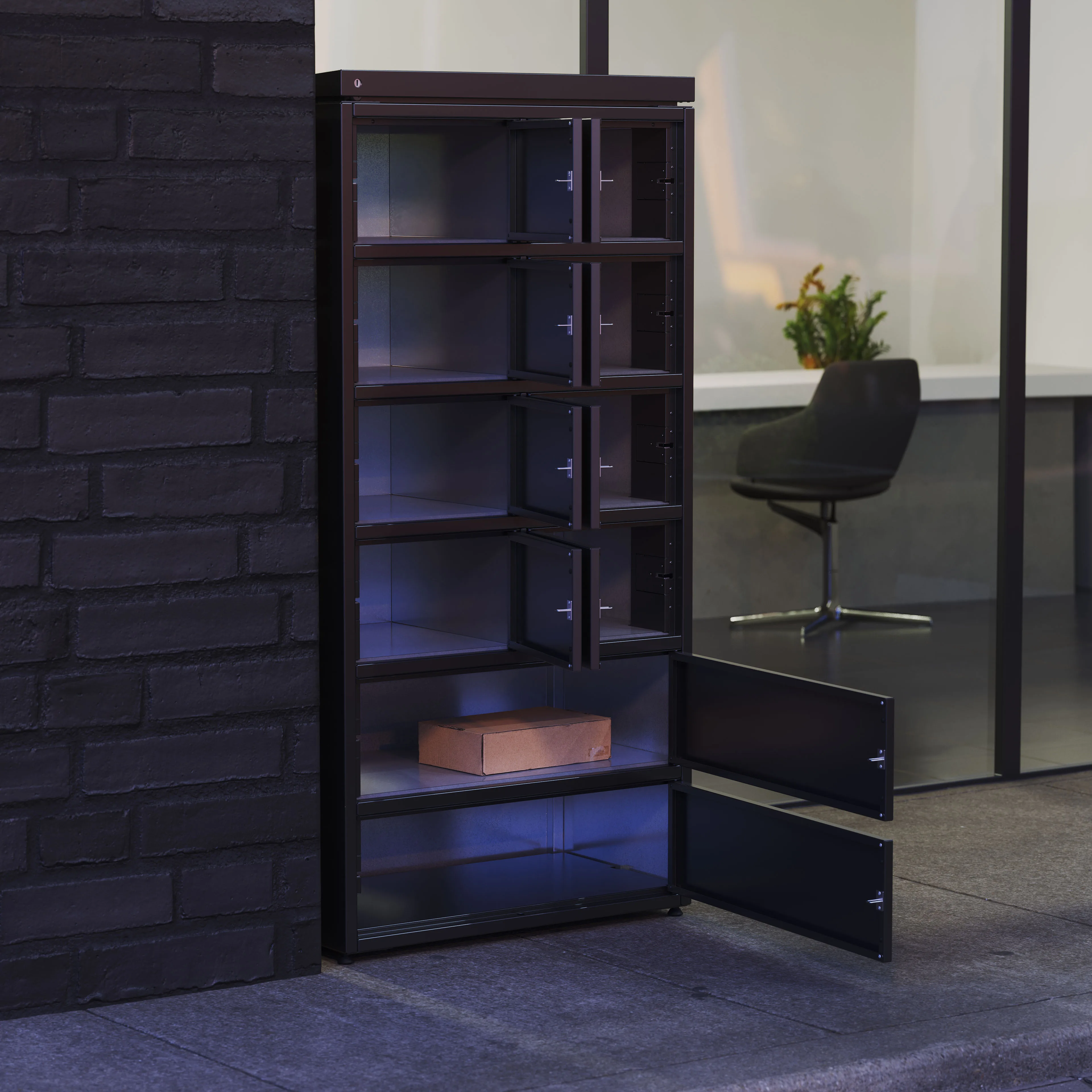 (Functionality: the lockers enable secure, app-assisted parcel handoffs for homes, businesses, and multi-unit buildings.)