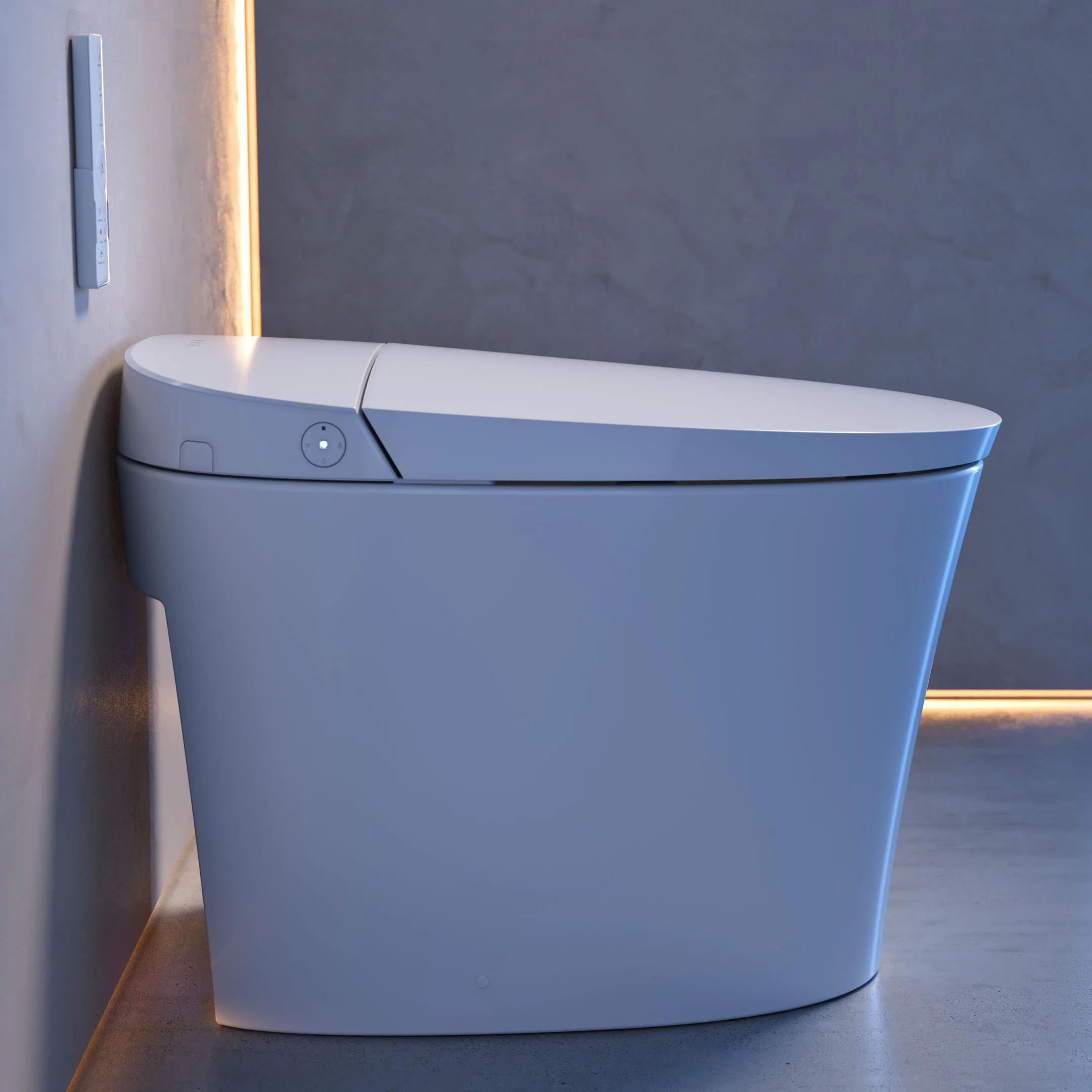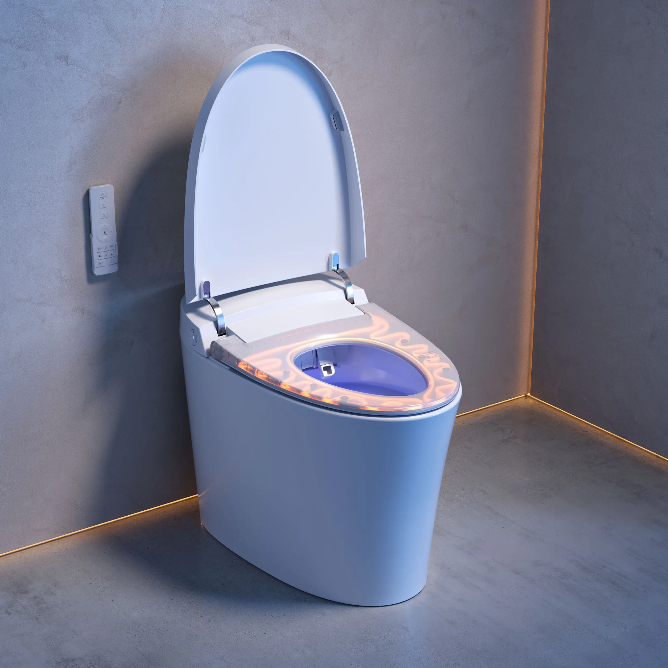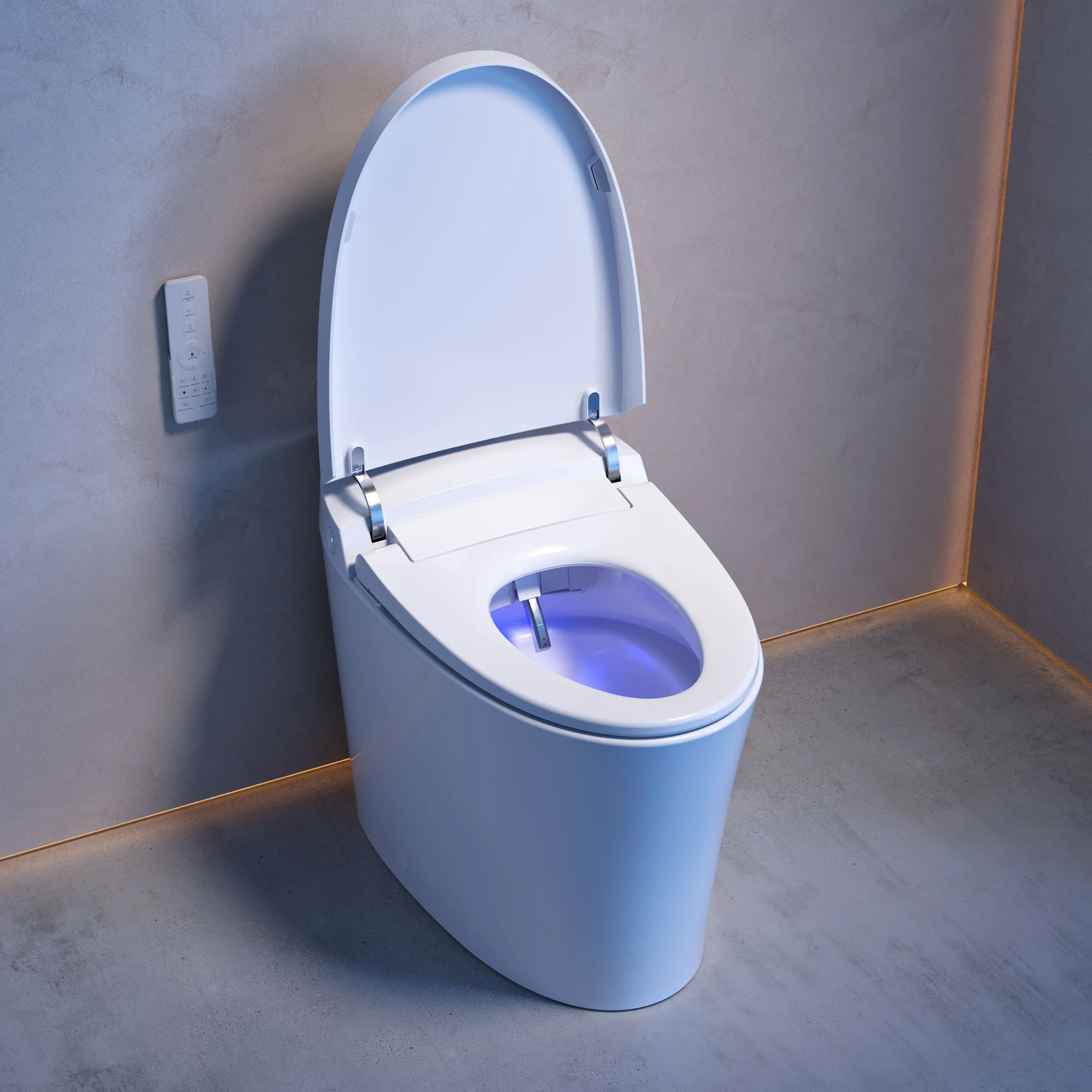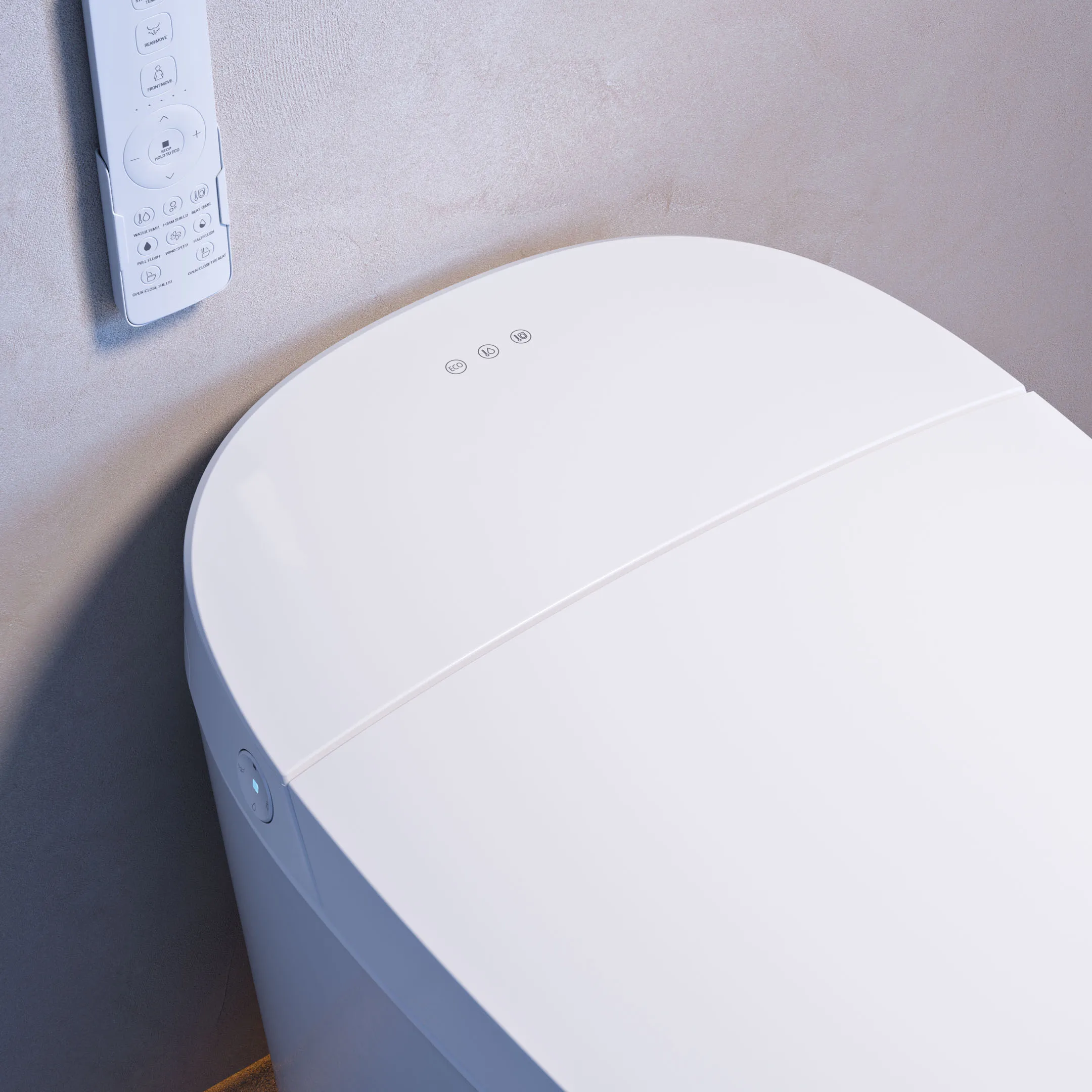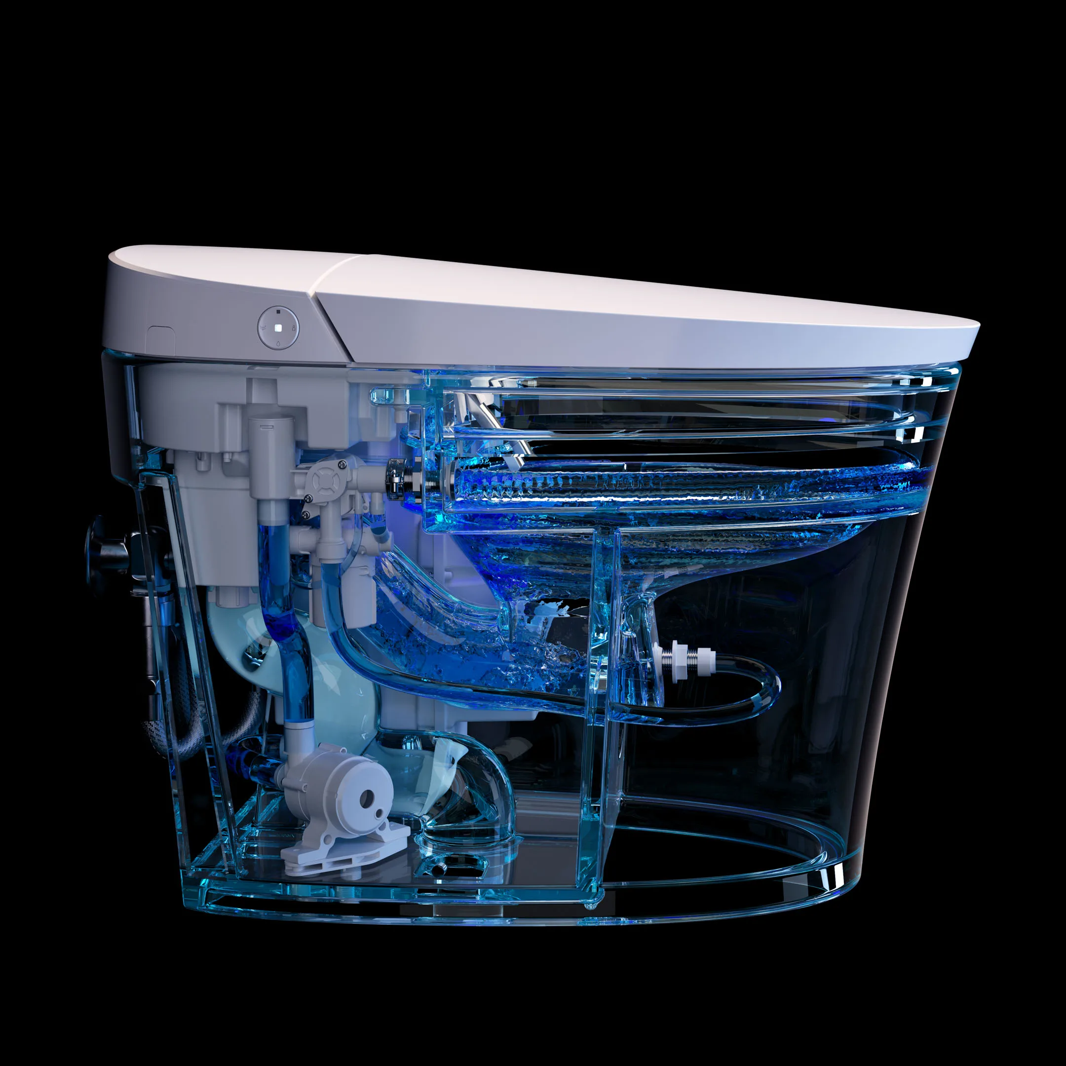 - Functionality Visualization: Animated demonstration of the smart toilet’s features, including bidet nozzle spray, automatic lid open/close, vortex flush, seat heating, and UV disinfection — rendered in cinematic close-ups for social and product videos.